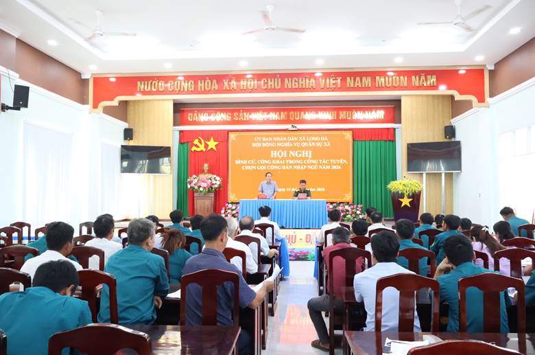Chiều 14-1, Hội đồng Nghĩa vụ quân sự xã Long Hà tổ chức Hội nghị bình cử, công khai trong công tác tuyển chọn, gọi công dân nhập ngũ năm 2026. Bí thư Đảng ủy, Chủ tịch HĐND xã Lê Anh Nam; Phó Bí thư, Chủ tịch UBND, Chủ tịch Hội đồng Nghĩa vụ quân sự xã Phạm Hồng Công; UV BTV, Chủ tịch UB MTTQ VN xã Nguyễn Thị Hương, Trung tá Trần Minh Tiến, Chỉ huy trưởng, Ban chỉ huy Quân sự xã, lãnh đạo các phòng, ban, đơn vị, Ban điều hành và Thôn đội trưởng 22 thôn cùng dự.