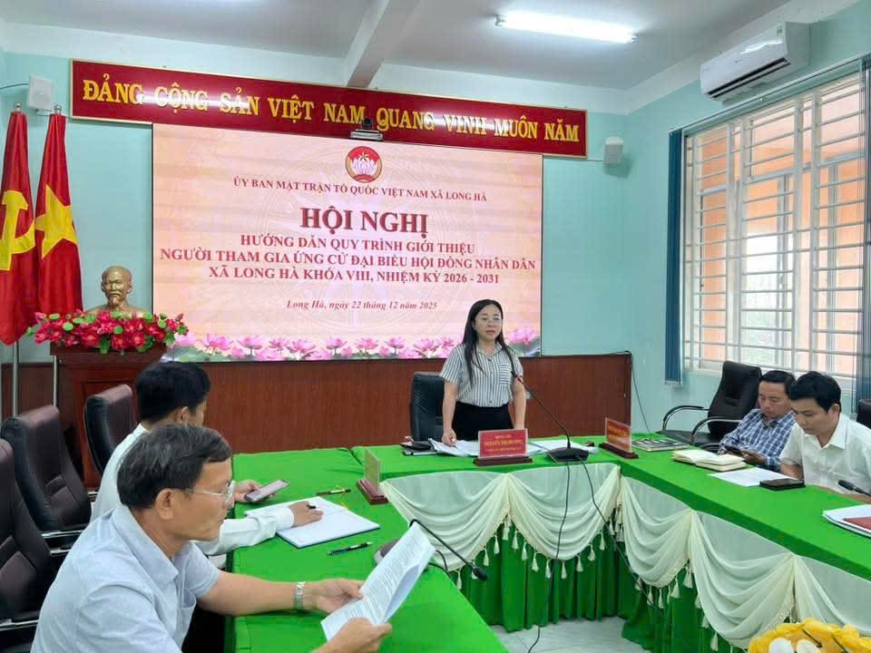 Chiều ngày 22/12, Ủy ban Mặt trận Tổ quốc Việt Nam xã Long Hà đã tổ chức hội nghị hướng dẫn quy trình giới thiệu người tham gia ứng cử đại biểu Hội đồng nhân dân xã Long Hà, nhiệm kỳ 2026–2031. Hội nghị có ý nghĩa quan trọng, là cơ sở để các cơ quan, tổ chức, đơn vị triển khai đúng quy trình các bước giới thiệu và hoàn chỉnh hồ sơ của người được giới thiệu ứng cử.