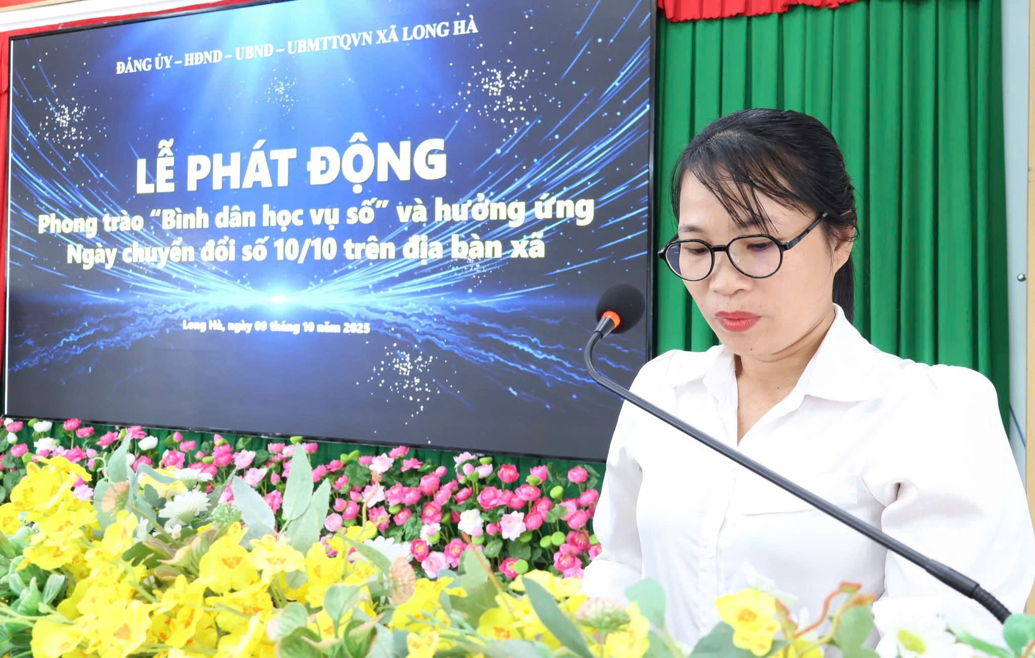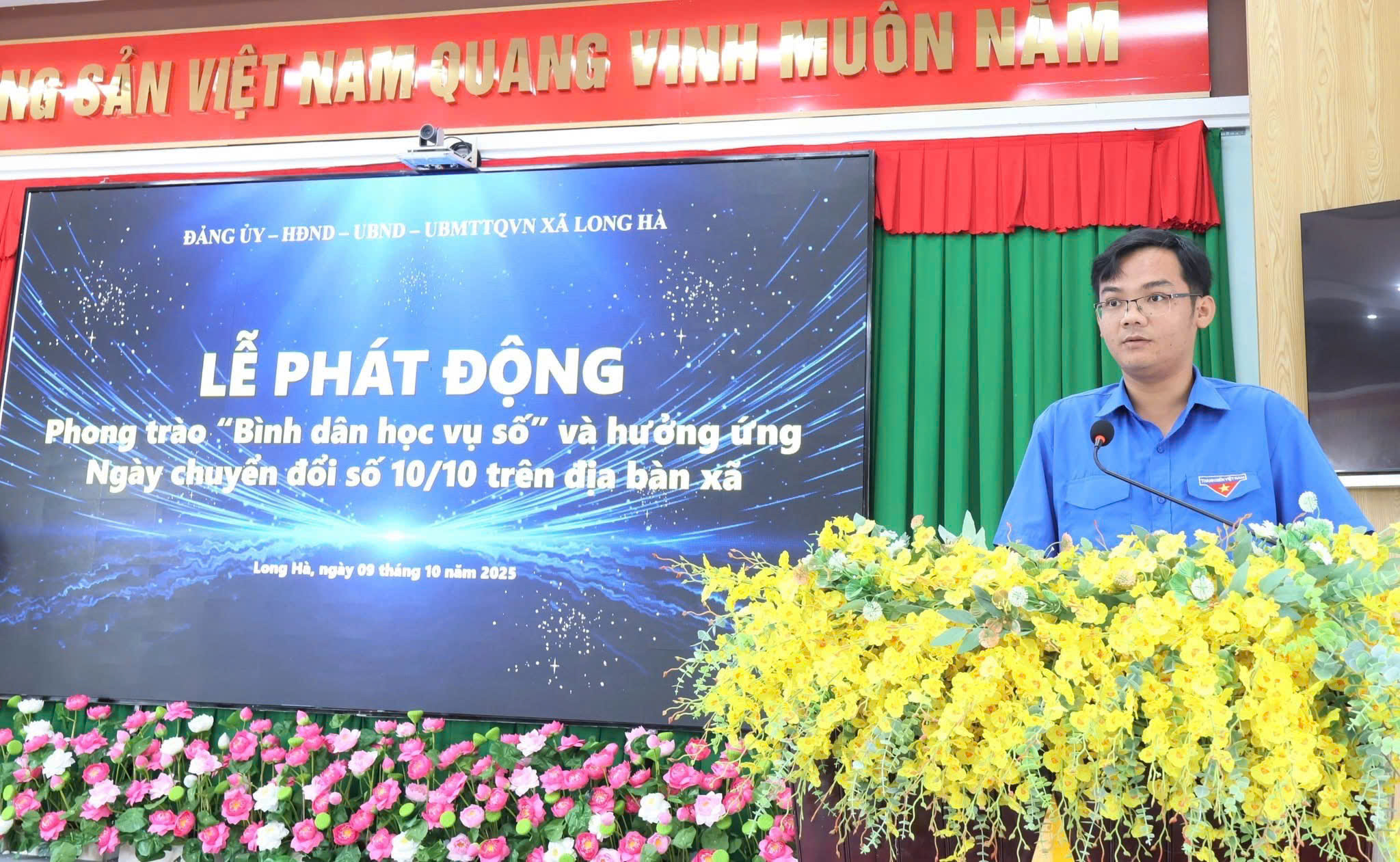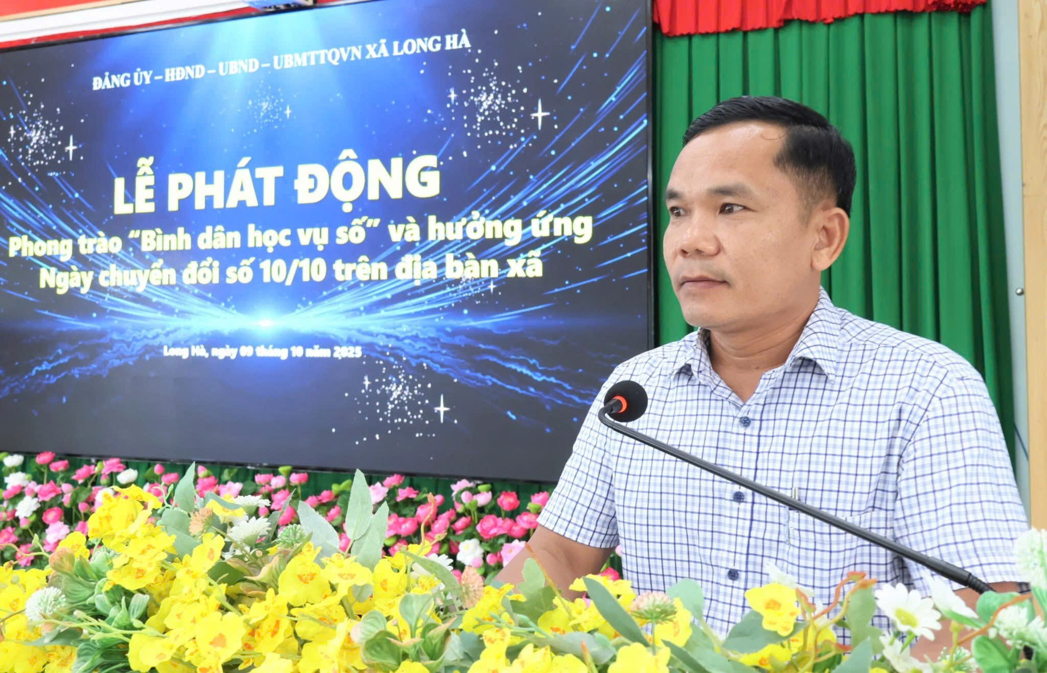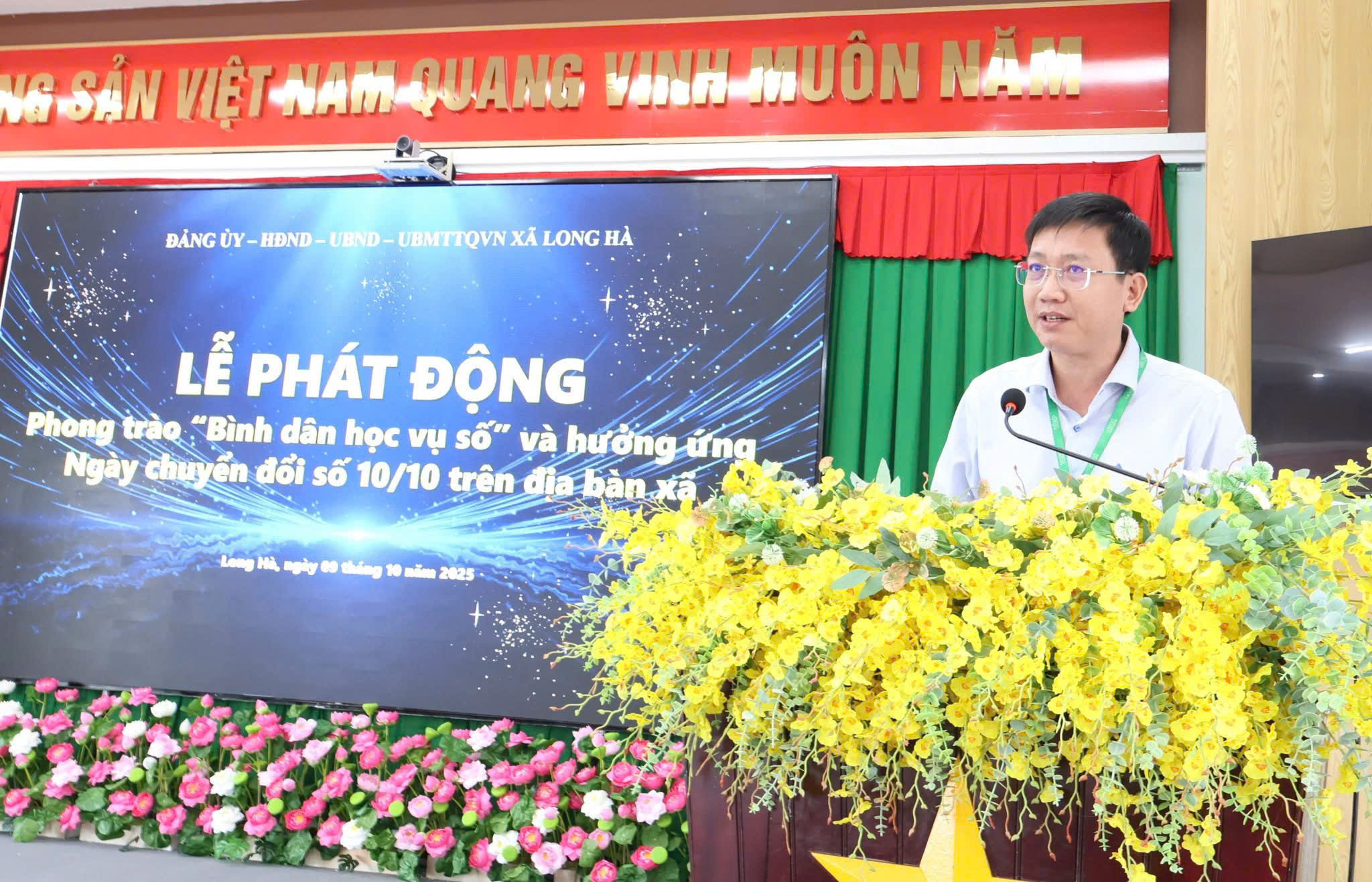 Sáng 9-10, UBND xã Long Hà tổ chức Lễ phát động phong trào “Bình dân học vụ số” và hưởng ứng ngày chuyển đổi số Quốc gia 10/10. Phó Bí thư Thường trực Đảng ủy xã Nguyễn Đình Quang; các Phó chủ tịch UBND xã Bùi Mạnh Cường, Lê Đình Trung, lãnh đạo MTTQ, các phòng, ban, đơn vị xã, Ban giám hiệu các trường học, Ban điều hành các thôn và Nhân dân cùng dự.