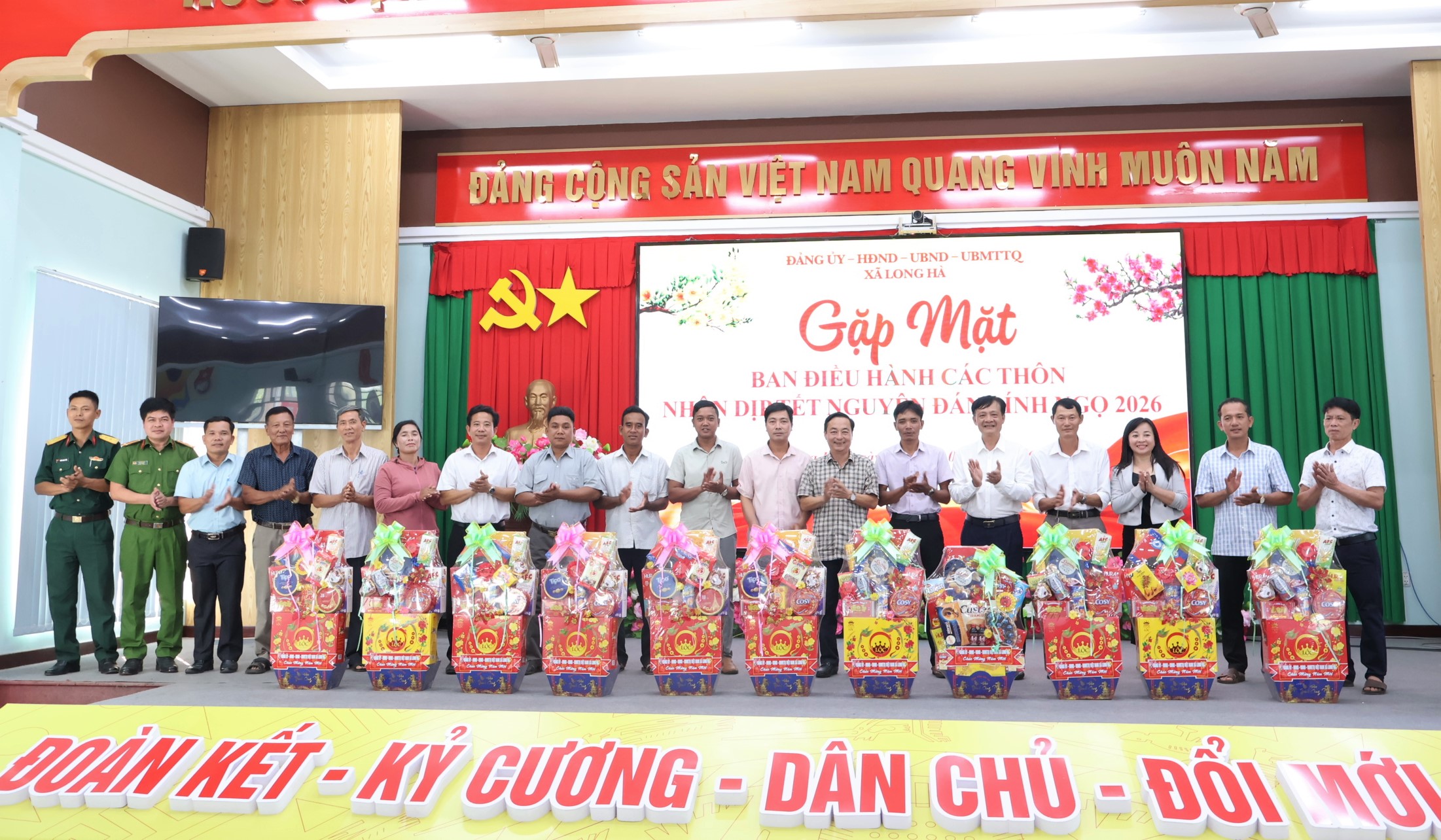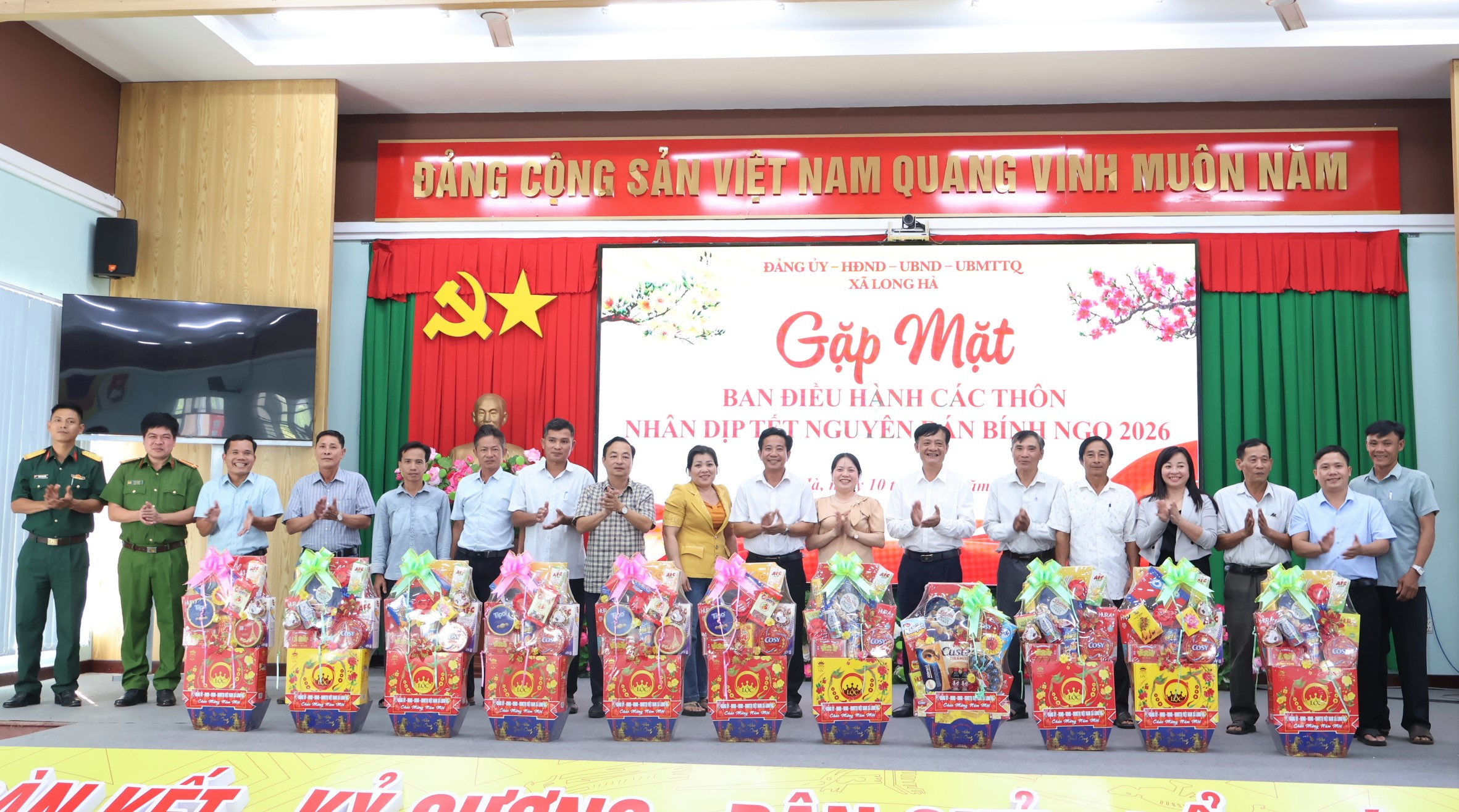 Chiều 10-2, Đảng ủy, HĐND, UBND, UB MTTQ VN xã Long Hà đã tổ chức gặp mặt Ban điều hành các thôn nhân dịp tết Nguyên đán Bính Ngọ 2026. Bí thư Đảng ủy, Chủ tịch HĐND xã Lê Anh Nam; Phó Bí thư Thường trực Đảng ủy Nguyễn Đình Quang; Phó Bí thư, Chủ tịch UBND xã Phạm Hồng Công; UV BTV, Chủ tịch UB MTTQ VN xã Nguyễn Thị Hương, lãnh đạo các phòng, ban, đơn vị xã cùng dự. Tại buổi gặp mặt, Bí thư Đảng ủy, Chủ tịch HĐND xã Lê Anh Nam; Phó Bí thư, Chủ tịch UBND xã Phạm Hồng Công đã thông tin nhanh kết quả công tác Đảng, thực hiện nhiệm vụ phát triển KT-XH, QP-AN của xã trong năm 2025, triển khai một số nhiệm vụ trọng tâm năm 2026, trong đó nhấn mạnh công tác chăm lo đời sống Nhân dân dịp Tết Nguyên đán Bính Ngọ, đảm bảo ANTT, đặc biệt là công tác bầu cử.