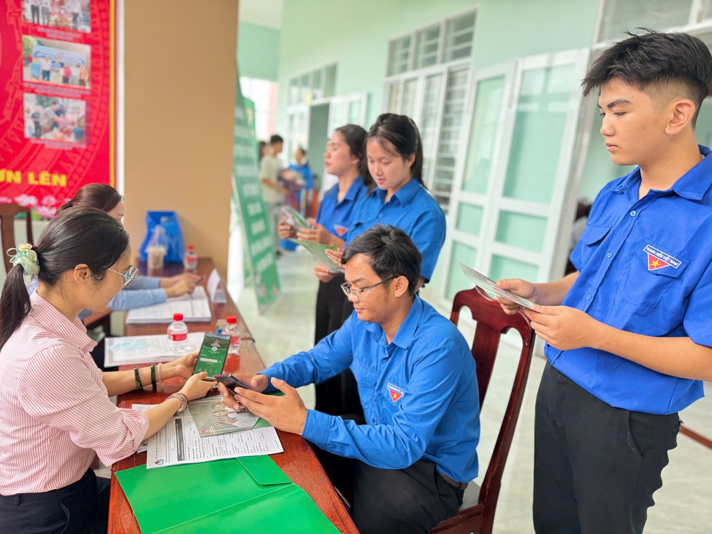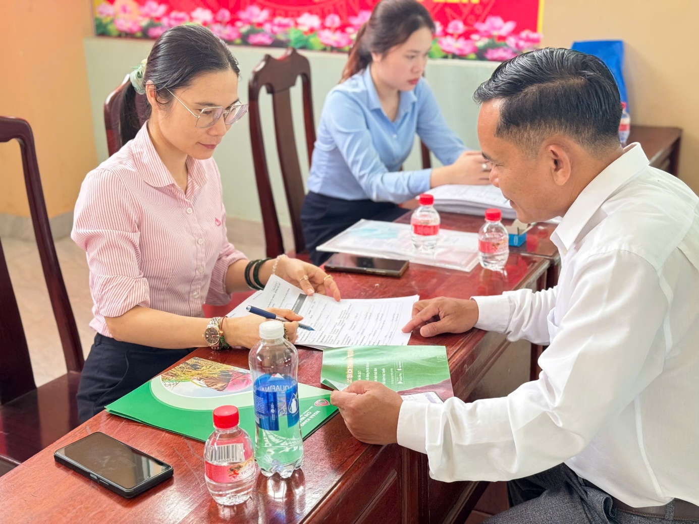 Ngân hàng Chính sách Xã hội Phú Riềng phối hợp với các hội đoàn thể xã hướng dẫn cài app banking và tham gia gửi tiết kiệm.