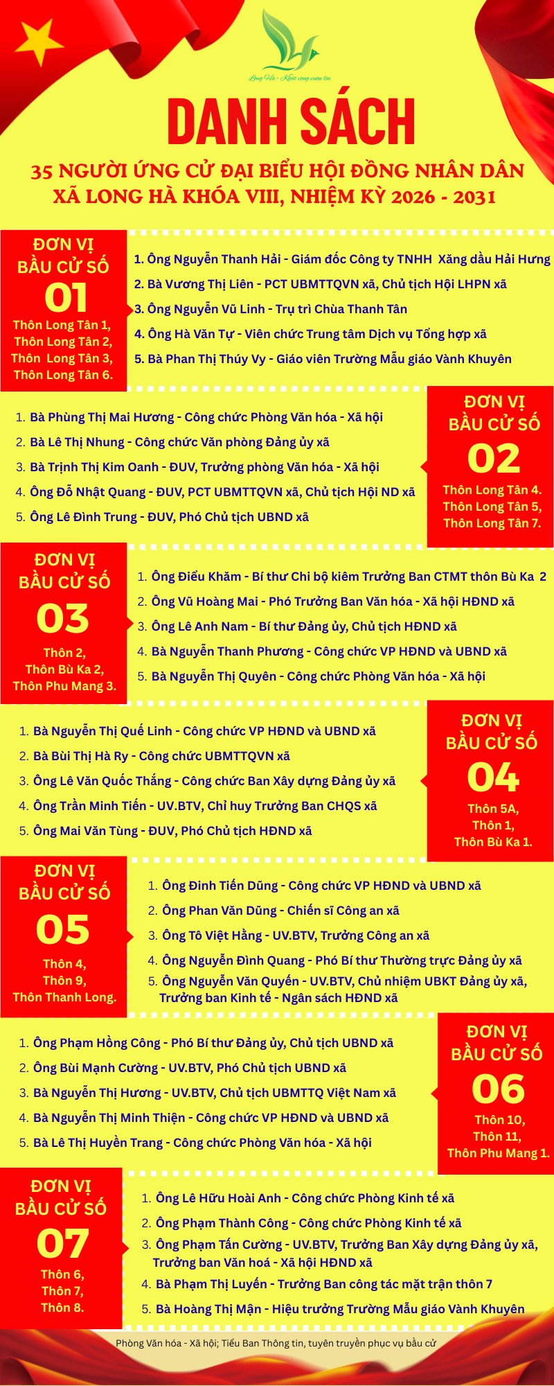 Danh sách 35 ứng cử viên đại biểu HĐND xã Long Hà khoá VIII, nhiệm kỳ 2026 - 2031