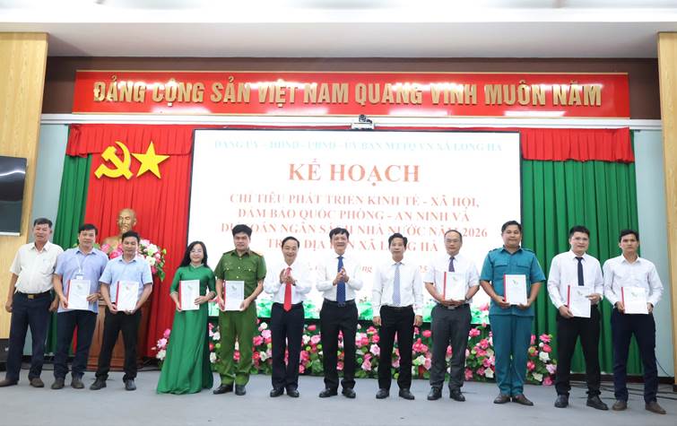 Lãnh đạo xã Long hà trao quyết định giao chỉ tiêu thực hiện nhiệm vụ năm 2026 cho các đơn vị.
