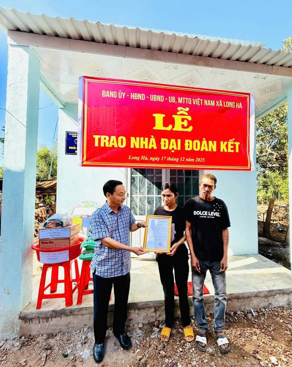 Sáng ngày 17/12/2025, trong không khí thi đua sôi nổi lập thành tích chào mừng thành công Đại hội Đại biểu Đảng bộ xã, Đại hội Đại biểu Mặt trận Tổ quốc Việt Nam xã và các tổ chức chính trị xã hội xã Long Hà lần thứ I, nhiệm kỳ 2025 – 2030, Đảng uỷ - HĐND - UBND - Ủy ban Mặt trận Tổ quốc Việt Nam xã Long Hà đã long trọng tổ chức Lễ trao tặng Nhà Đại đoàn kết cho gia đình ông Điểu Grít, thôn Bù Ka 2, thuộc hộ khó khăn về nhà ở trên địa bàn xã.