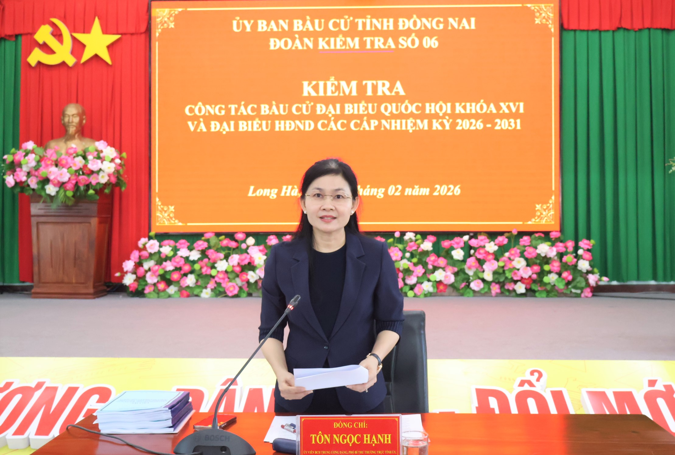 Sáng 09-2, tại xã Long Hà, đoàn kiểm tra số 06 của Ủy ban Bầu cử (UBBC) tỉnh Đồng Nai do UV BCH Trung ương Đảng, Phó Bí thư Thường trực Tỉnh ủy, Chủ tịch HĐND tỉnh, Phó Chủ tịch UBBC tỉnh Tôn Ngọc Hạnh làm trưởng đoàn, đã kiểm tra công tác bầu cử Đại biểu Quốc hội khóa XVI và Đại biểu HĐND các cấp, nhiệm kỳ 2026-2031 đối với các xã Long Hà, Phú Riềng và Phú Trung. UV BTV Tỉnh ủy, Phó Chủ tịch Thường trực UBMTTQ VN tỉnh Hà Anh Dũng; UV BTV Tỉnh ủy, Bí thư Đảng ủy phường Bình Phước Giang Thị Phương Hạnh; TUV, Giám đốc Sở Văn hóa, Thể thao và Du lịch Lê Thị Ngọc Loan; Giám đốc Sở Dân tộc và Tôn giáo Trần Thanh Hòa; Giám đốc Sở Ngoại vụ Huỳnh Thị Bé Năm; lãnh đạo, chuyên viên theo dõi công tác bầu cử, thường trực ủy ban Bầu cử 18 xã, phường phía Bắc Đồng Nai cùng dự.