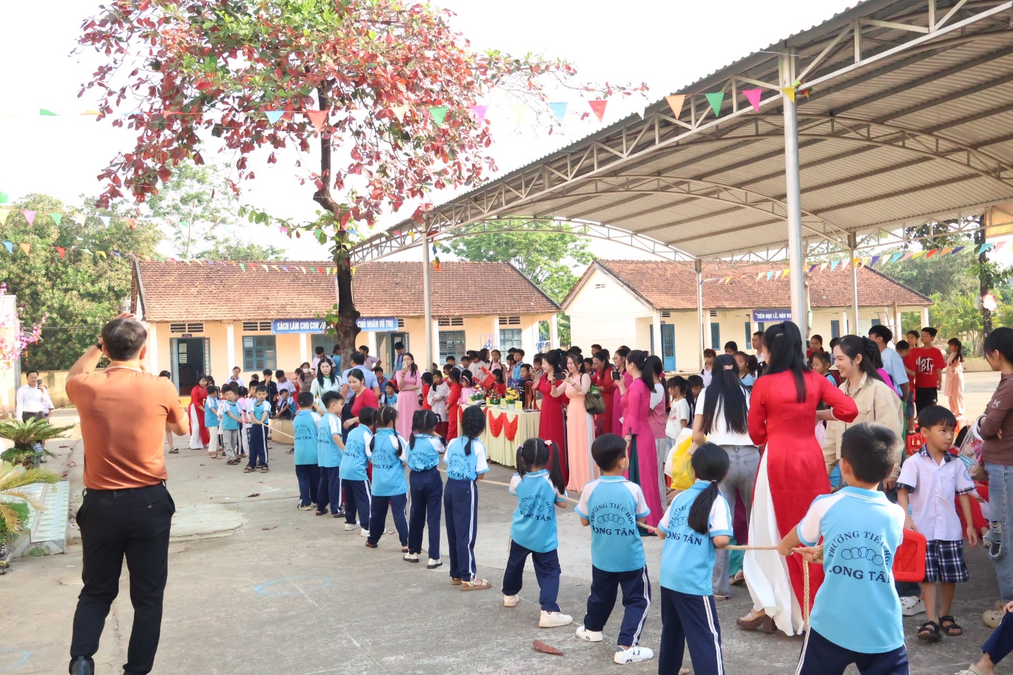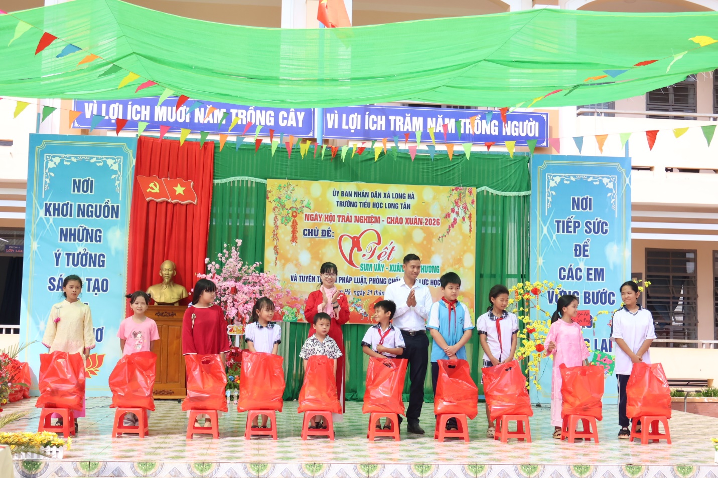 Vừa qua, Trường tiểu học Long Tân tổ chức Ngày hội trải nghiệm- chào xuân 2026 với chủ đề “Tết sum vầy - Xuân yêu thương”, lồng ghép tuyên truyền pháp luật, phòng chống bạo lực học đường cho học sinh. Bí thư chi bộ, Hiệu trưởng trường Tiểu học Long Tân Nguyễn Thị Uyên; Trung tá Dương Thành Nam, Phó trưởng Công an xã, đông đảo giáo viên, nhân viên, học sinh và Phụ huynh cùng tham gia. Theo đó, ngày hội trải nghiệm được tổ chức với chuỗi hoạt động thiết thực: trang trí chậu cây hoa mai, đào; trưng bày mâm quả, làm bánh chưng ngày tết, tổ chức các trò chơi dân gian và biểu diễn văn nghệ. Giáo viên và học sinh nhà trường cùng mặc trang phục truyền thống, đậm nét xuân; các em được thỏa sức sáng tạo, thể hiện sự khéo léo tạo nên những chậu hoa, mâm cỗ đặc sắc, đầy sáng tạo những vẫn giữ được nét truyền thống trong ngày tết cổ truyền. Các tiết mục văn nghệ sôi động, mội dung kéo co, ô ăn quan thu hút đông đảo cổ động viên đến xem và cổ vũ, tất cả đã tạo nên một không khí vui tươi, sôi nổi nhưng không kém phần ấm áp, gợi nên những nét đẹp truyền thống trong ngày tết cổ truyền của dân tộc.