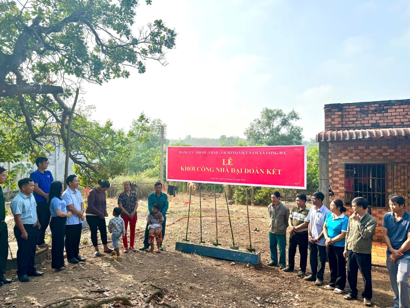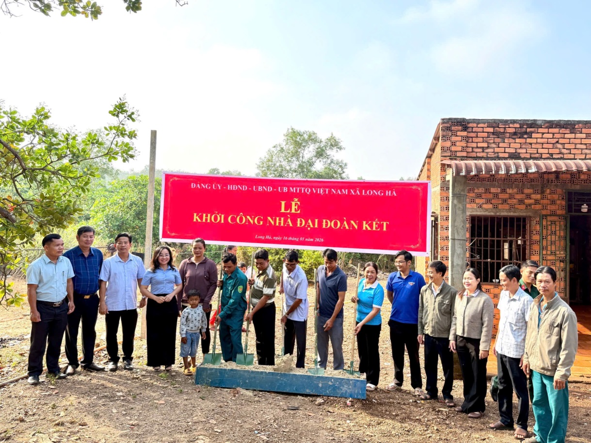 Sáng ngày 16/01/2025, Đảng ủy – HĐND – UBND - Ủy ban MTTQ Việt Nam xã Long Hà tổ chức Lễ khởi công xây dựng Nhà Đại đoàn kết cho hộ đồng bào dân tộc thiểu số có hoàn cảnh khó khăn về nhà ở trên địa bàn xã năm 2026. Dự chương trình có đồng chí Nguyễn Đình Quang – Phó Bí thư Thường trực Đảng ủy, Đ/c Nguyễn Thị Hương – UV.BTV, Chủ tịch Ủy ban MTTQVN xã, đ/c Mai Văn Tùng – ĐUV, Phó Chủ tịch HĐND xã, Đ/c Lê Đình Trung – ĐUV, Phó Chủ tịch UBND xã cùng lãnh đạo các tổ chức chính trị - xã hội xã, Chi bộ, ban điều hành thôn, Ban CTMT thôn Long Tân 6 và đại diện gia đình được hỗ trợ xây dựng nhà Đại đoàn kết.