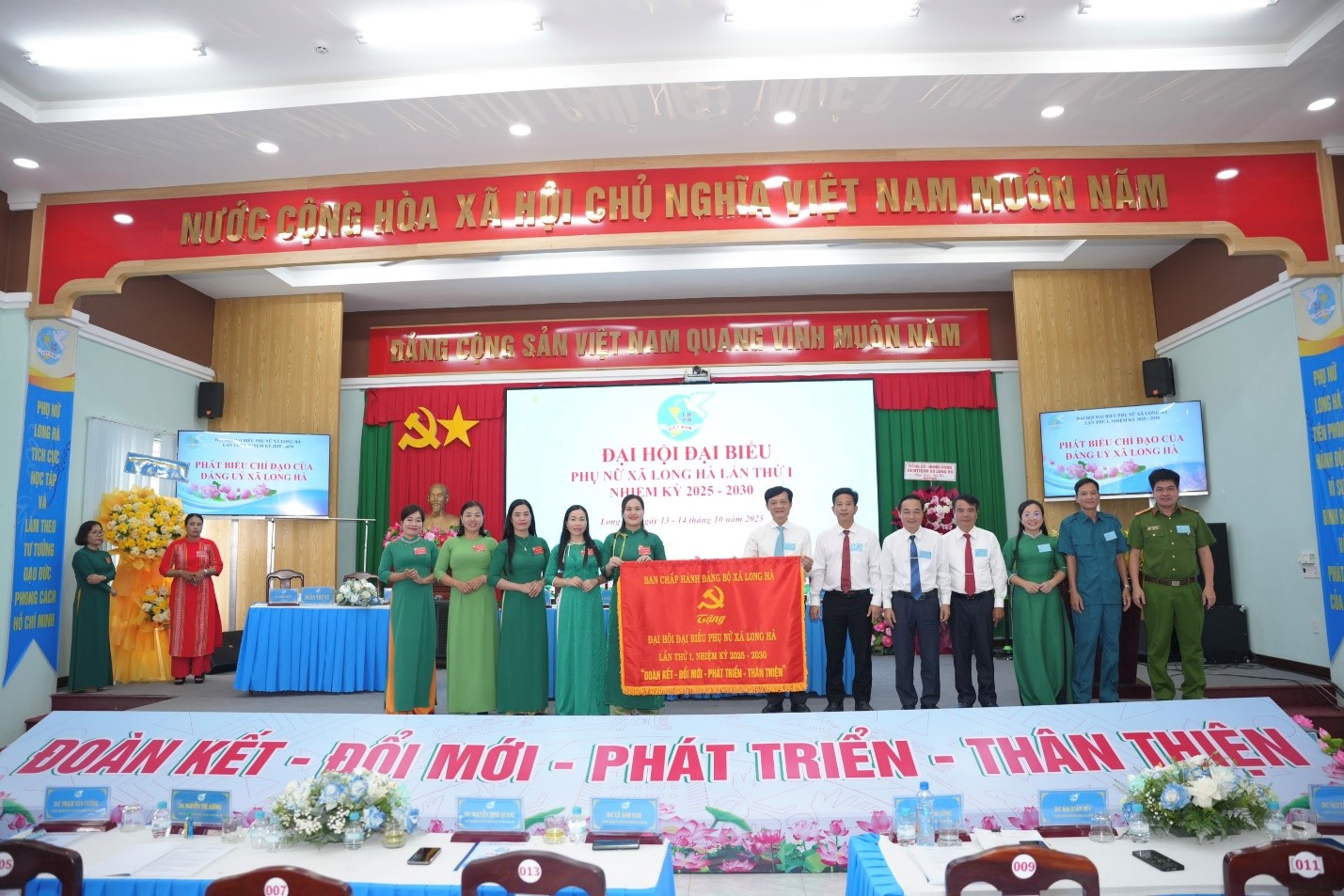 Lãnh đạo Đảng ủy, HĐND, UBND, UB MTTQ VN xã Long Hà tặng hoa và chụp hình lưu niệm cùng Ban chấp Hành Hội LHPN xã nhiệm kỳ 2025-2030.